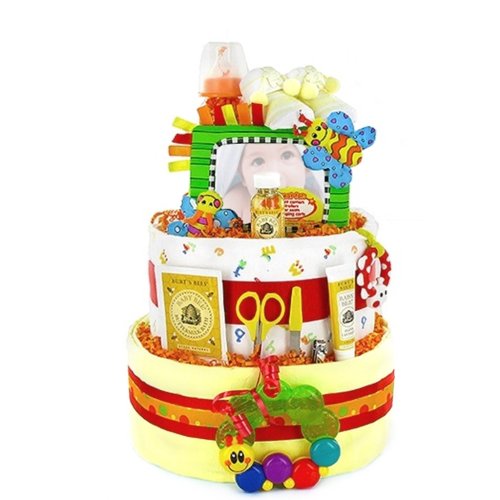 This bright and fun two tier diaper cake is sure to be the hit of the shower! Colorful receiving blankets, Burt's Bees all natural baby products and fun toys for baby make this cake a gift to remember.