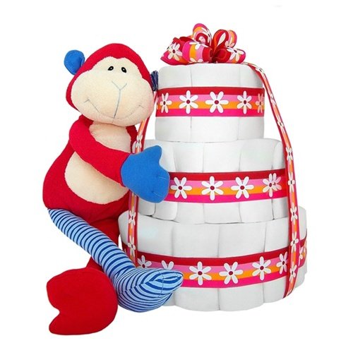 Practical, whimsical and oh so much fun, this adorable "Monkey Hugs" 3-tier baby diaper cake is perfect for the newborn little girl! It's made with over 75 Level 1 Pampers Swaddlers and accompanied by the adorable GUND Happy Moments Busy Buds monkey! This whimsical diaper cake also makes a great baby shower gift or table centerpiece!